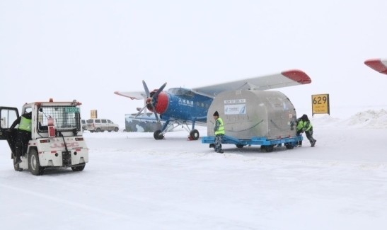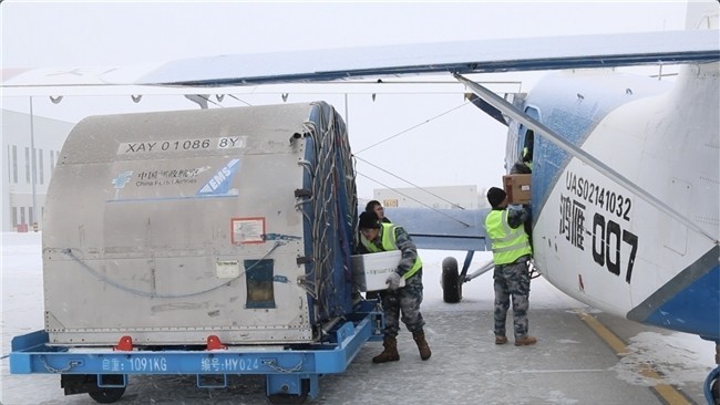 工作人员在风雪中从无人机上卸货至邮政转运箱